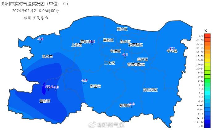 气温:2月21日5时,我市气温实况(℃):零下7.3(登封)~零下4.8(荥阳)。