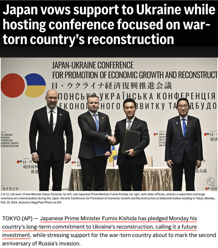 最新的例子,就是日本刚刚举办的“日乌经济复兴推进会”。这次会上,日乌政府和企业共签署数十份合作文件,涵盖电力和交通等重点基建领域。