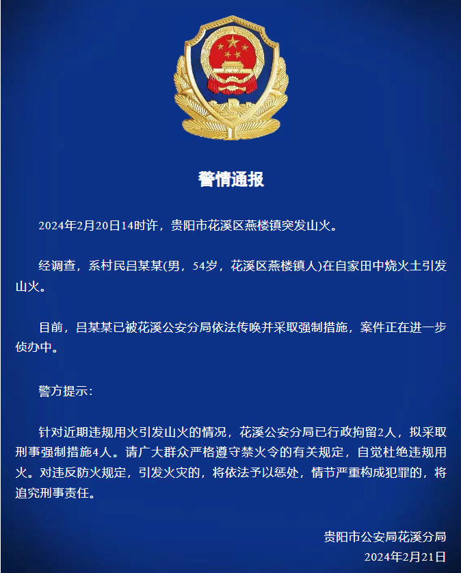 经调查,系村民吕某某(男,54岁,花溪区燕楼镇人)在自家田中烧火土引发山火。