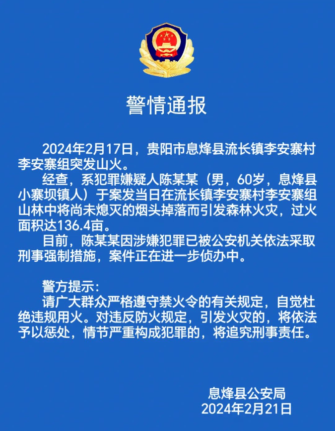 经查,系犯罪嫌疑人陈某某(男,60岁,息烽县小寨坝镇人)于案发当日在流长镇李安寨村李安寨组山林中将尚未熄灭的烟头掉落而引发森林火灾,过火面积达136.4亩。