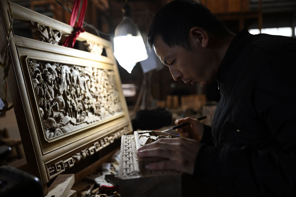 这些雕刻精美、构造考究的徽派建筑由厂里的260多位工匠营造搭建,复杂的古建由上万个构件组成,需要耗时近一年时间建造。经过拆解装运后,它们将从这个皖南山区的工厂走向全国多地的公园、文化街区和博物馆,成为展示徽文化的窗口。