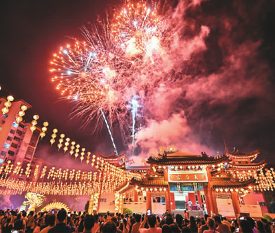 马来西亚首都吉隆坡拍摄的天后宫烟花表演。 新华社记者 程一恒摄