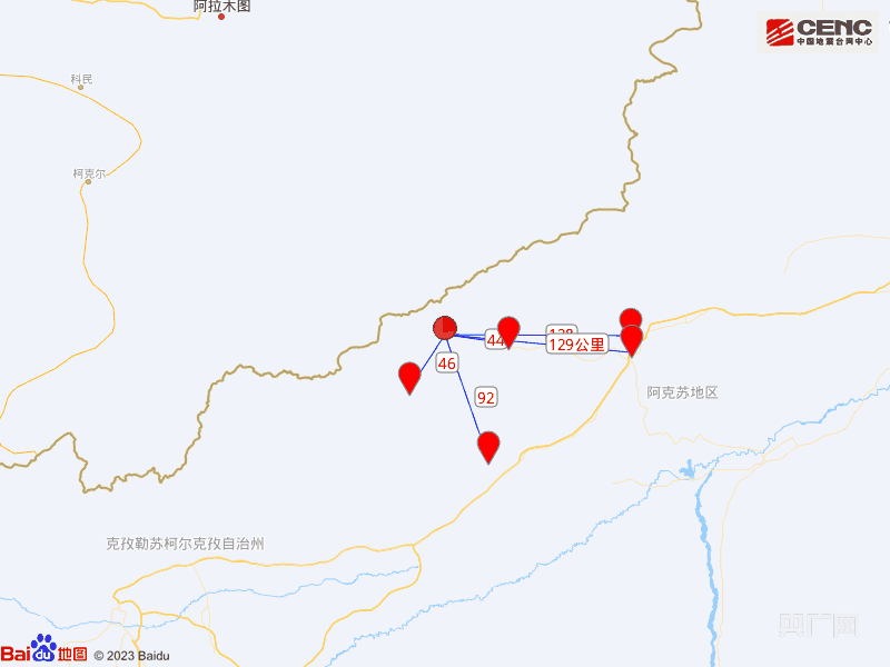 周边县城:震中距乌什县44公里、距阿合奇县46公里、距柯坪县92公里、距温宿县128公里、距阿克苏市129公里,距阿克苏地区131公里,距乌鲁木齐市784公里。