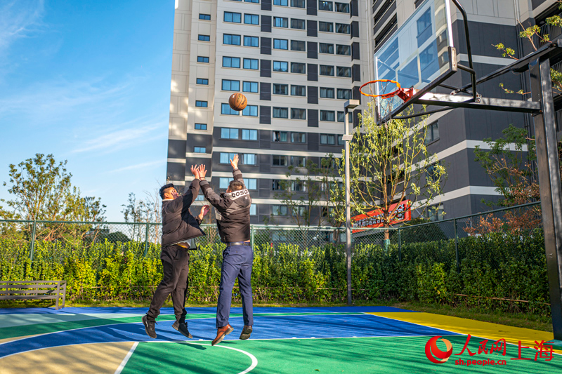 工作之余,张颂蔚(右)喜欢与室友打打篮球。 人民网记者 王初摄