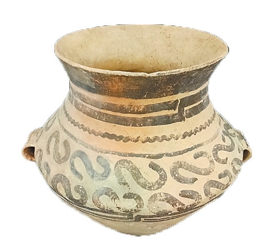 展览第二部分主要展示辛店文化的陶器。这一时期彩陶纹饰以黑彩为主,也有紫红彩,有的施白色或紫红色陶衣。辛店彩陶的标志性纹饰是以条带纹构成的类似羊角的双勾纹,图案简洁,别具一格。辛店彩陶中还有一定数量的羊、犬、鹿、鸟等动物纹饰,反映出当时畜牧业的繁荣。