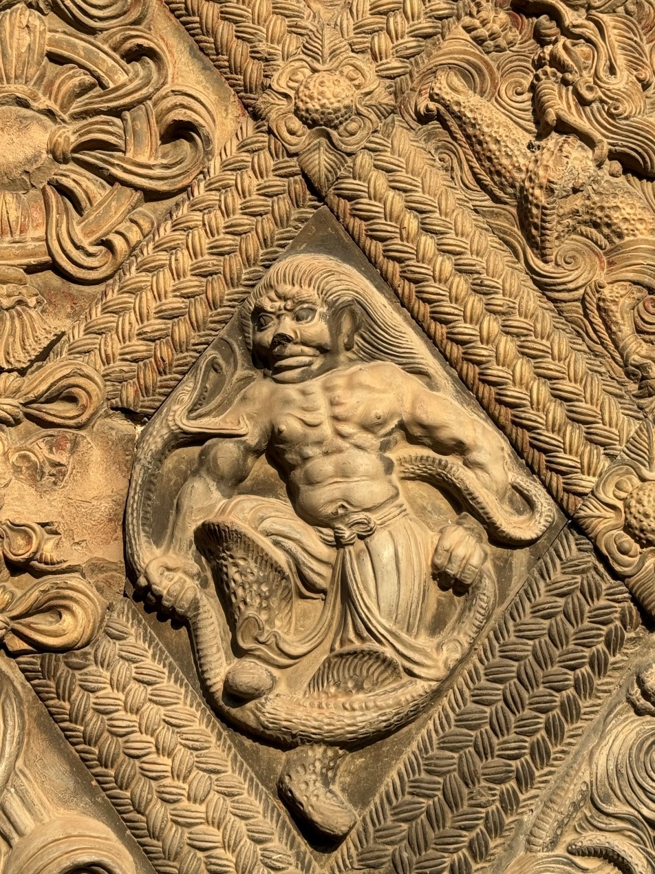游客1:修定寺塔的建筑风格确实与众不同,每块砖上还有立体浮雕…等等,好像所有的浮雕图案还都不一样!