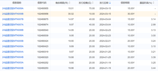 诚通控股为国资委控股的央企,联合资信在今年3月的最新评级为AAA。据企业预警通,诚通控股共有86只存续债券,规模1762.22亿元。在30年期的“24诚通控股MTN009B”之前,今年诚通控股已发行多只期限10年以上的中票,包括15年、20年,发行利率逐步下行。