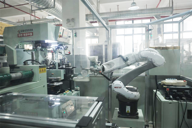 3月20日上午,在位于商丘市睢县的中乔体育产业园,流水线有序运转,机械臂智能运行,工人们有条不紊地忙着手上的工作,一双双崭新漂亮的鞋子从这里“走”向世界。