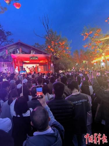 演出开始前45分钟,舞台前的小广场已聚集了不少观众。护栏前最好的位置被几十个早早到来的短视频博主和直播间主播占据,他们支起了三脚架和自拍杆,只待开工。舞台左侧高处有座位的看台上坐满了围观的游客。景区保安告诉记者,这些游客至少提前一个半小时就来占座了。随着演出时间的临近,舞台周围的空地、隔壁饭店的门口、茶楼的二层阳台,凡是能看到舞台的地方都站满了人。