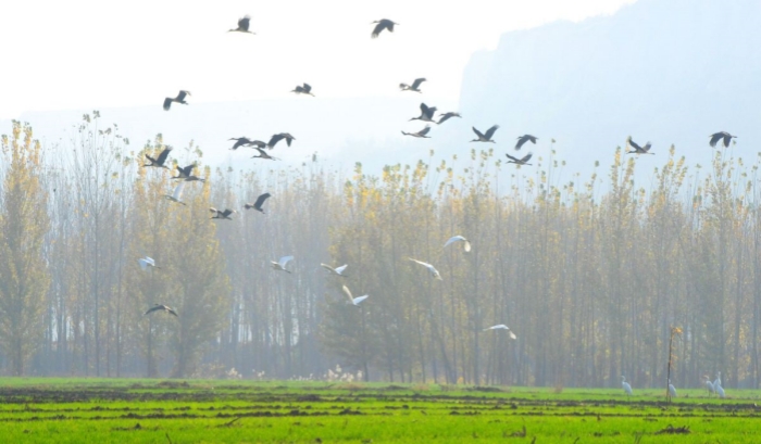 图为山西稷山汾河国家湿地公园白鹭与黑鹳齐飞。栗卢建 摄