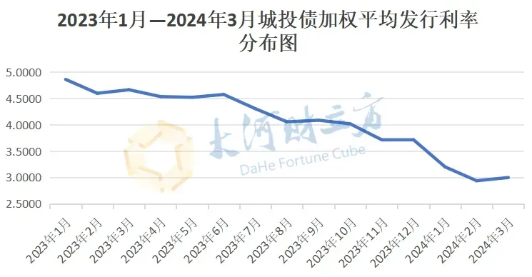 利率屡创新低现象频繁发生的背后,是城投债一级市场上发行利率总体趋于下行。Wind数据显示,自2023年1月起,城投债发行利率整体呈现下降的趋势。其中,今年1月城投债加权平均发行利率创自2023年以来最大跌幅,较2023年12月下降52bp。2月、3月城投债加权平均发行利率更是维持在3%以下。