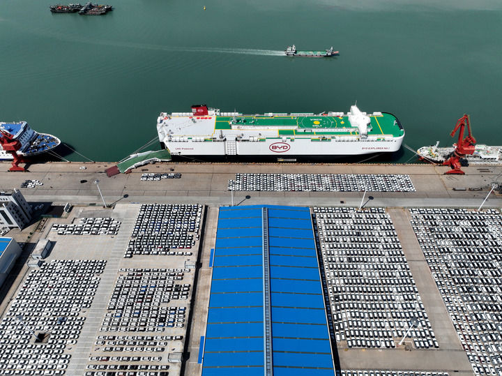 2024年4月25日,在江苏连云港港东方港务分公司码头68泊位,滚装轮正在装载新能源汽车出口巴西。新华社发(王春 摄)