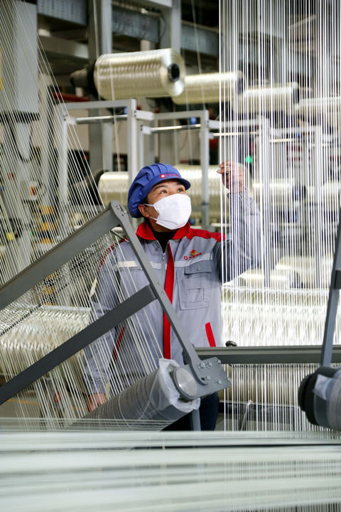 2023年1月31日,在江苏省连云港市中复神鹰碳纤维有限公司,工人正在车间生产高性能碳纤维。新华社发(王春 摄)