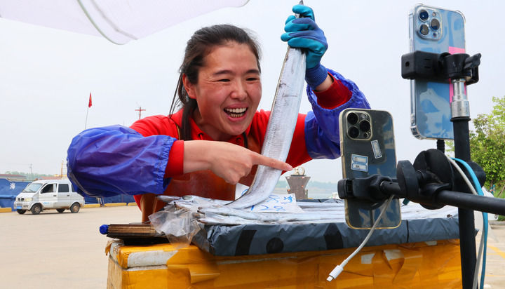 2024年4月22日,连云港市赣榆区下口渔港码头,渔民在直播推介带鱼产品。新华社发(耿玉和 摄)