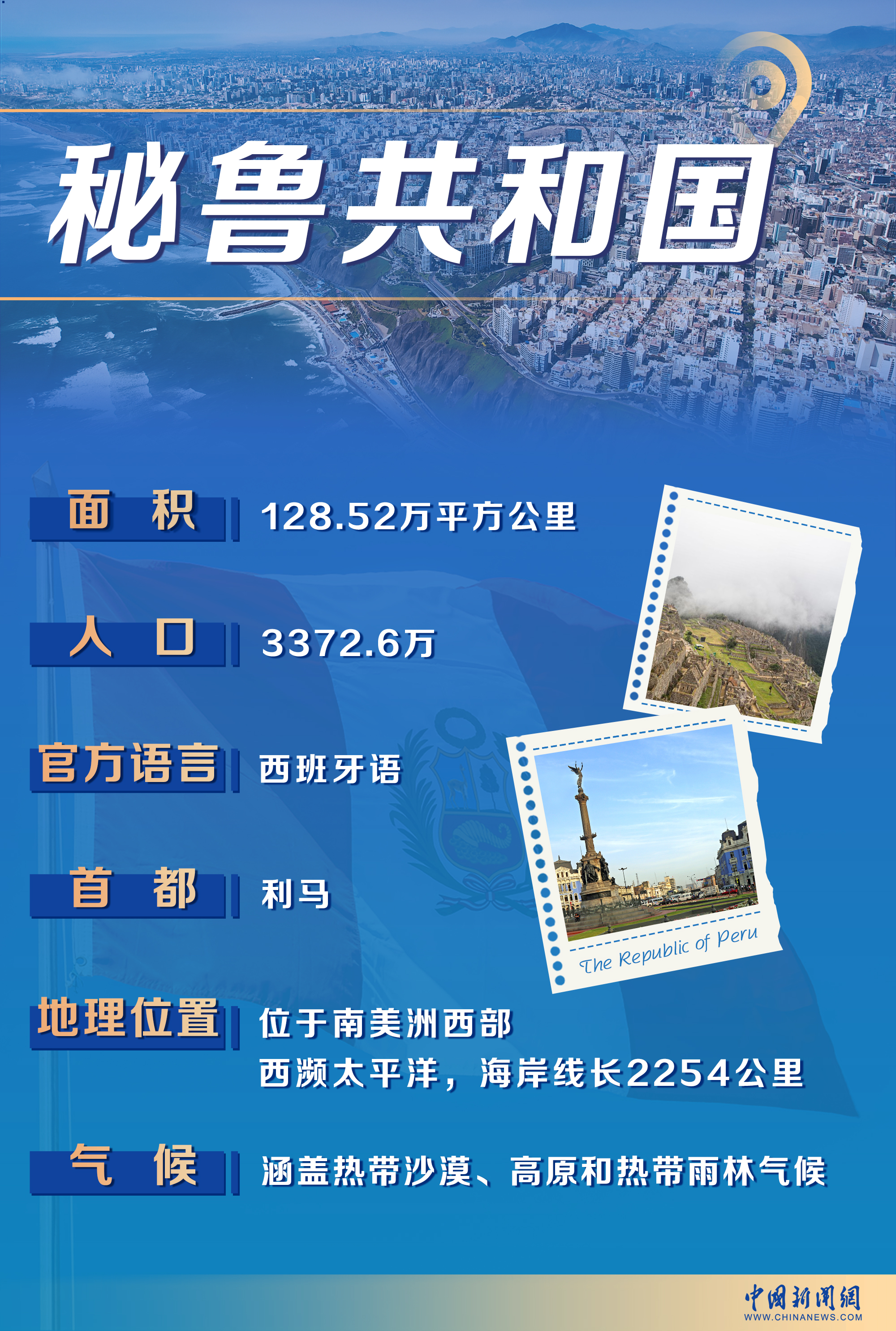 秘鲁位于南美洲西部,西濒太平洋,拥有2254公里的海岸线。首都是历史悠久的利马,全国人口达3372.6万,官方语言为西班牙语。