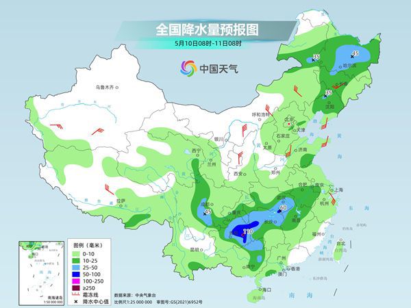 受暖湿气流和冷空气共同影响,未来三天,南方新一轮较强降水开启,降雨重心主要位于贵州到江南、华南北部一带,部分地区有大到暴雨,局地大暴雨,主要降雨时段集中在10日夜间至11日。同时,今明天,华北、黄淮、东北等地有阵雨或雷阵雨,部分地区有强对流天气。