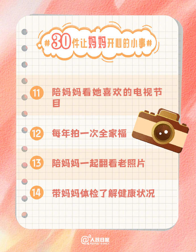 打卡收藏!30件让妈妈开心的小事 2024-05-12人民日报微博 母亲是总会向你敞开的怀抱,是无尽的爱与支持,是我们永远的起点和归宿。你都如何表达对妈妈的爱?爱藏在细节里,让妈妈开心的30件小事↓↓评论区分享你有哪些爱妈妈的小细节,传递爱意,愿妈妈健康快乐! 编辑:祝萍