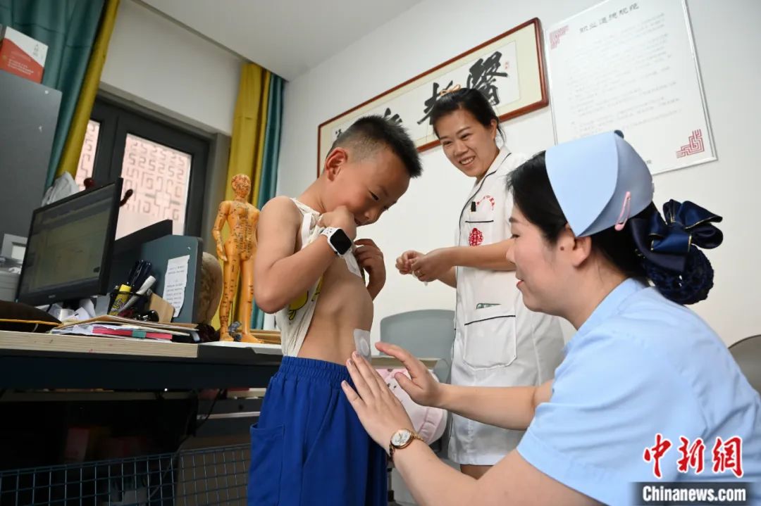 2023年7月11日,入伏首日,在内蒙古呼和浩特市一医院内,医护人员为小朋友贴“三伏贴”。“三伏贴”是一种传统的冬病夏治疗法。刘文华 摄