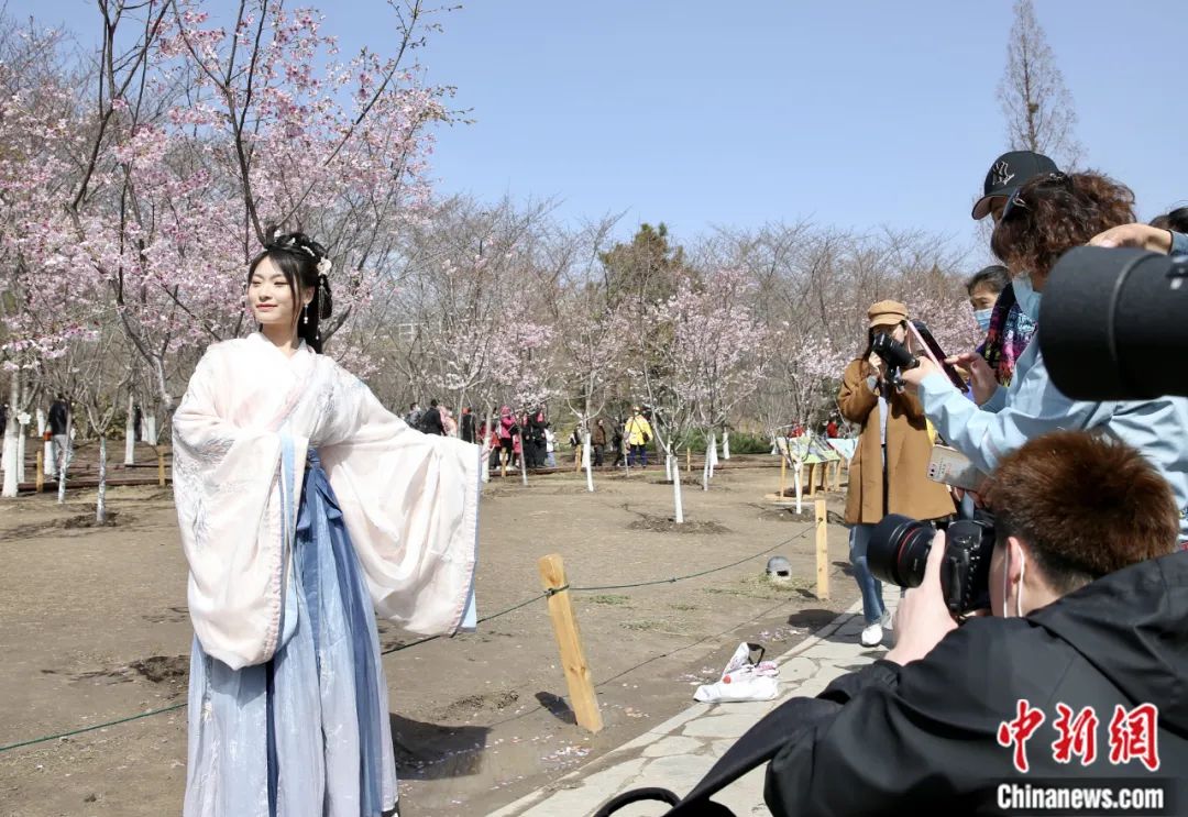 2021年北京玉渊潭公园春季赏花文化活动在春分节气开幕,一名穿汉服的游客在樱花树前拍照。易海菲 摄