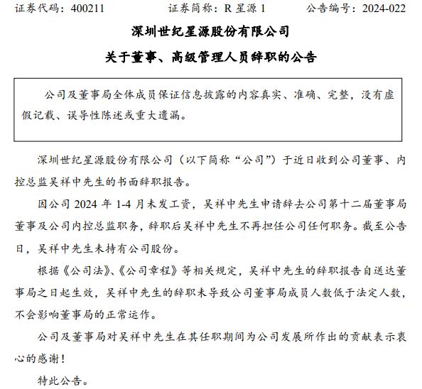 【大河财立方消息】因4个月未发工资,深圳世纪星源股份有限公司(以下简称:世纪星源)董事、内控总监吴祥中近日向公司提交了辞职报告。