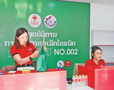 老挝万象一处快递收发站的工作人员为电商快件粘贴标签。本报记者 杨 一摄