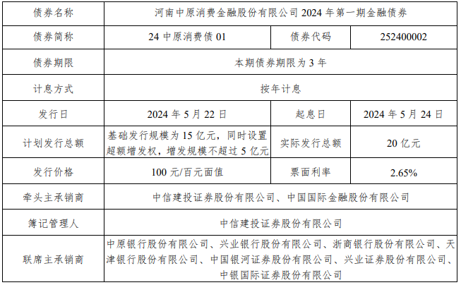 5月23日,中国货币网披露的公告显示,河南中原消费金融股份有限公司2024年金融债券(第一期)成功发行。