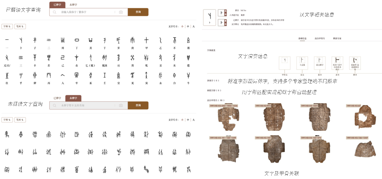 平台还整合了现有字形数据资源,建立了全球最大的甲骨文单字数据库,覆盖143万甲骨文单字,为专家学者和爱好者提供了强大的文字智能搜索工具。