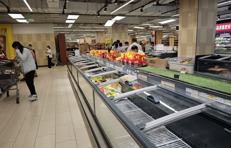 【大河财立方 记者 陈薇 实习生 王宇 张雪逃 文图】5月31日,郑州永辉超市信万广场店将闭店调改。5月30日,门店内粽子、水饺等冷藏冷冻食品、米面油等商品正在打折处理,吸引了不少市民抢购,永辉的工作人员正在清理部分已经被抢空的货架。