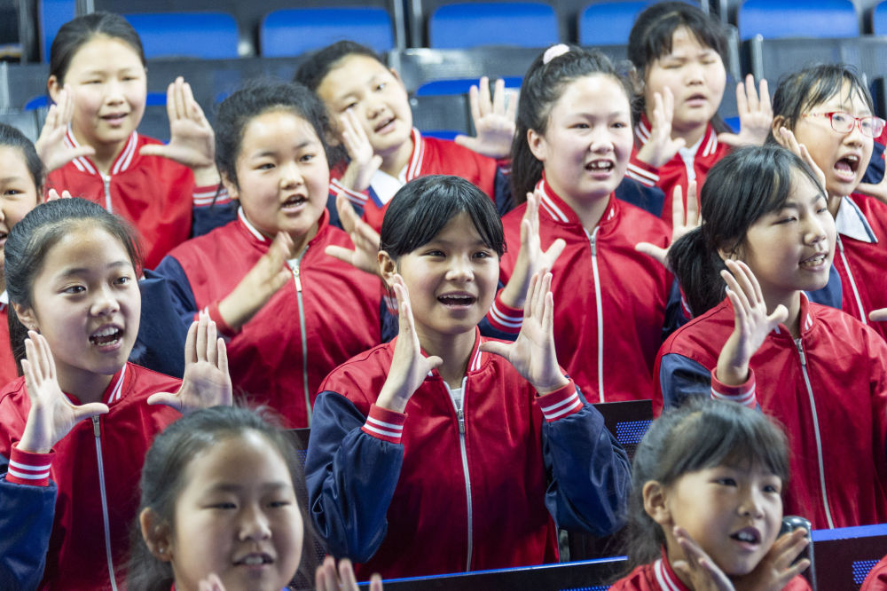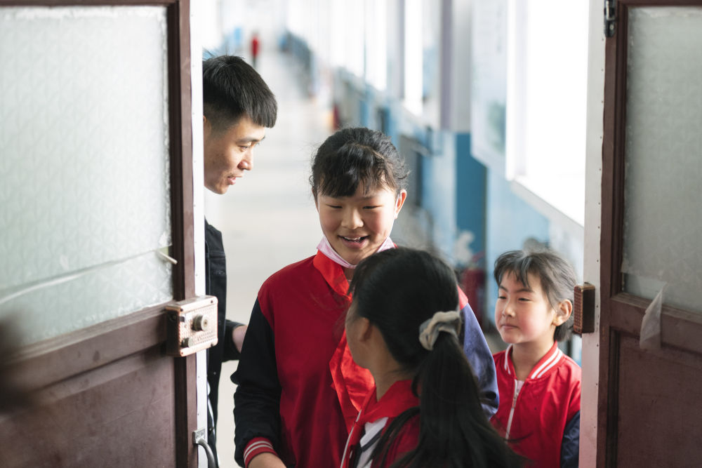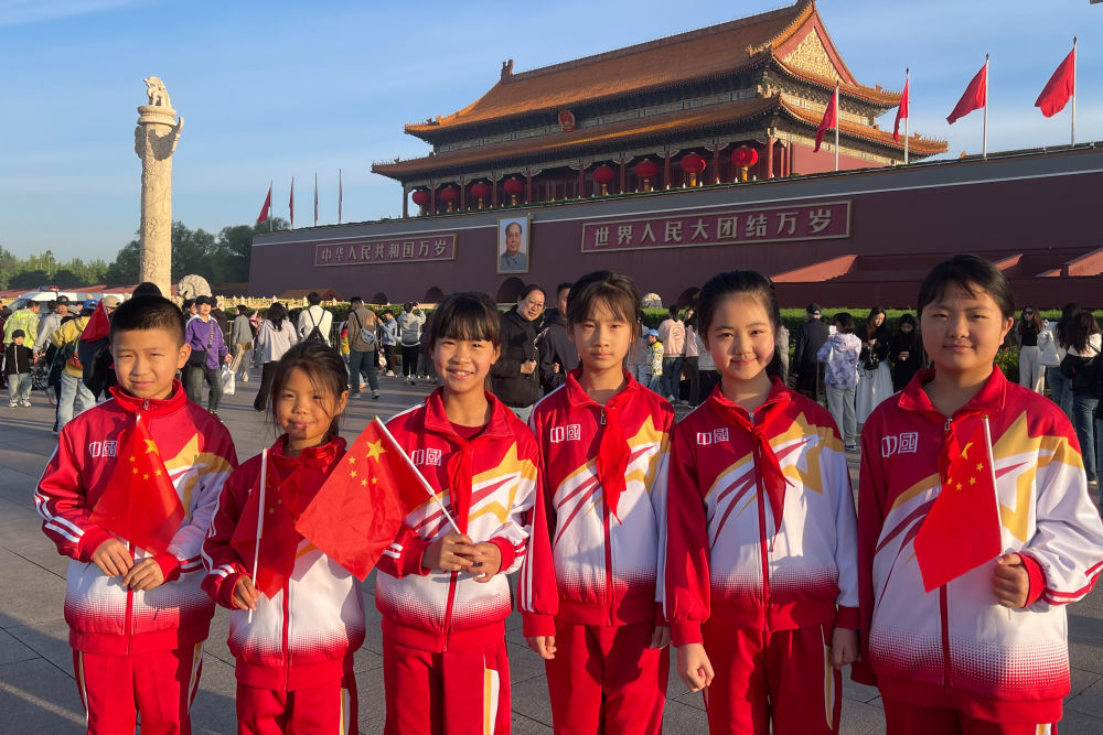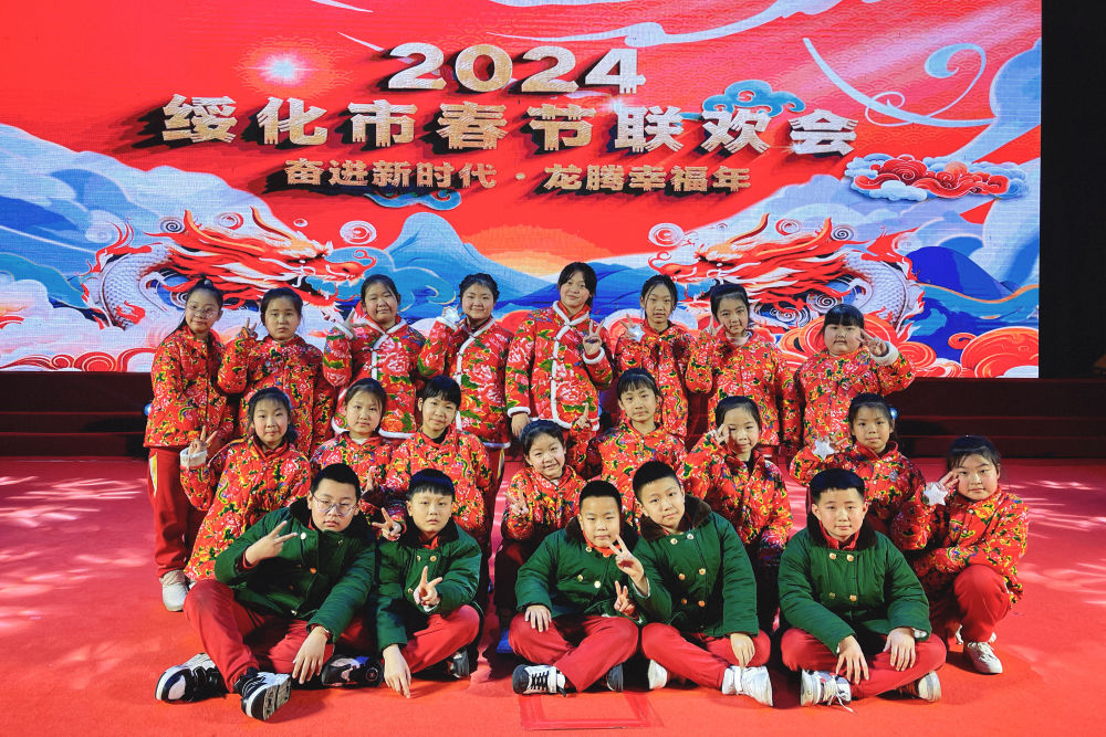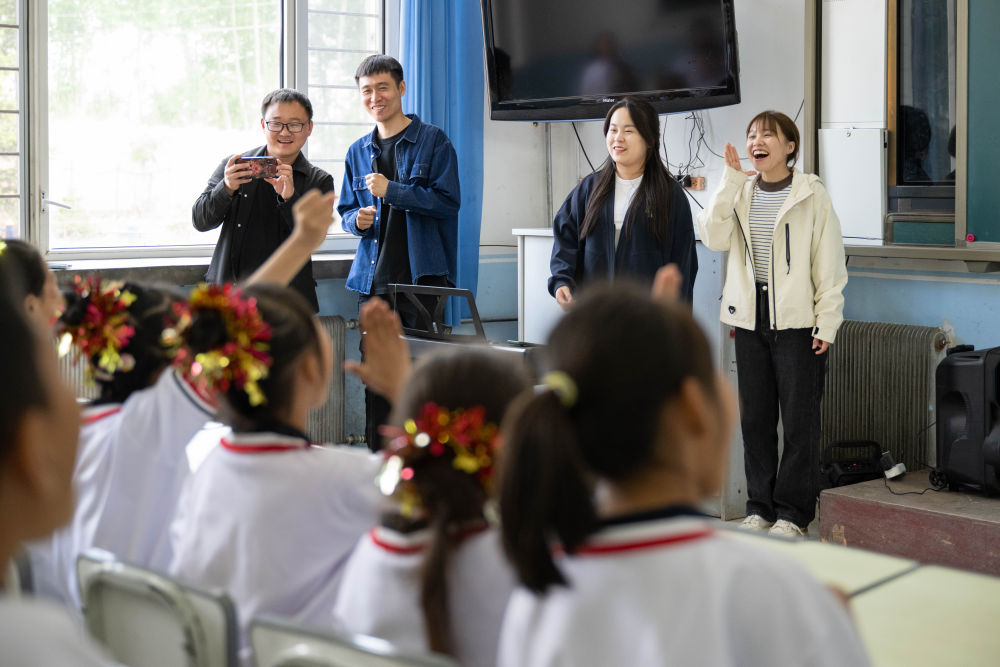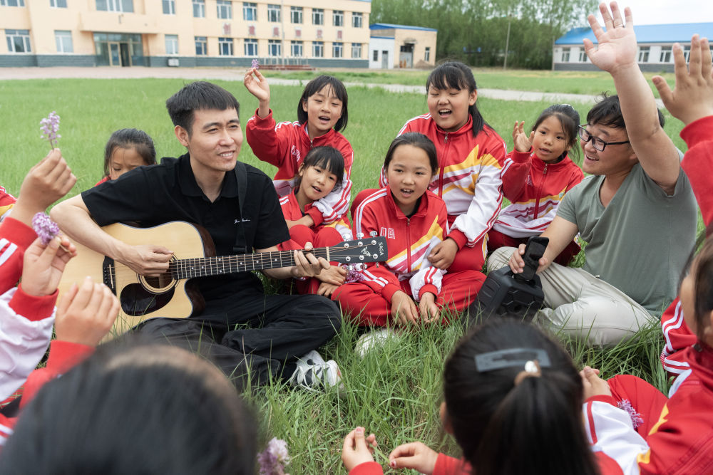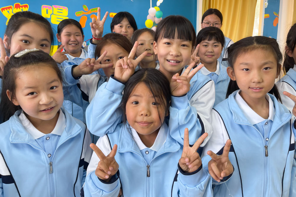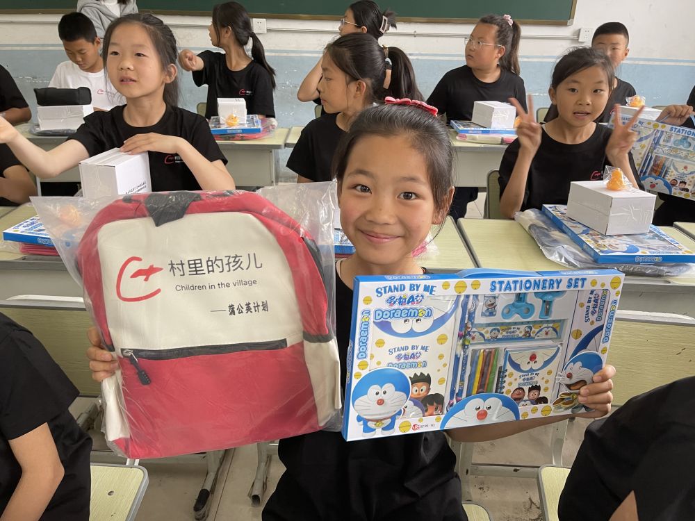 5月30日,在安达市中本镇中心小学,“村里的孩儿”音乐班的新成员展示所收到的由爱心企业捐赠的儿童节礼物,包括衣服、书包、文具等。
