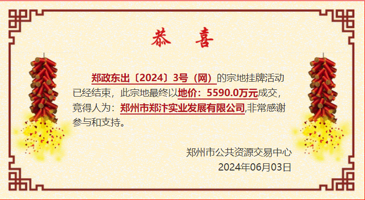 【大河财立方消息】6月3日,郑政东出〔2024〕3号(网)国有建设用地使用权完成挂牌出让,成交价5590万元,由郑州市郑汴实业发展有限公司竞得。
