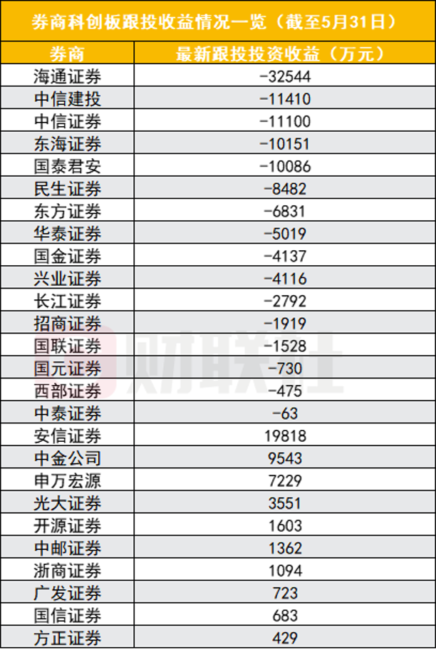 图为券商科创板跟投收益情况一览(截至5月31日)