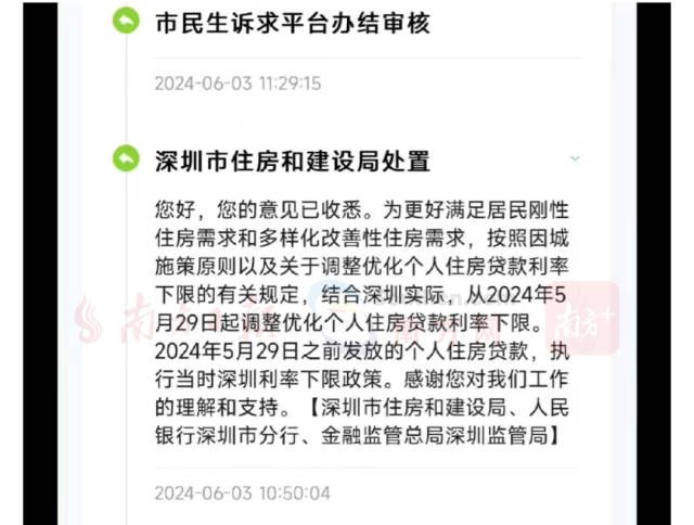 对此,深圳市住房和建设局、人民银行深圳市分行、金融监管总局深圳监管局在回复市民咨询时表示:为更好满足居民刚性住房需求和多样化改善性住房需求,按照因城施策原则以及关于调整优化个人住房贷款利率下限的有关规定,结合深圳实际,从2024年5月29日起调整优化个人住房贷款利率下限。2024年5月29日之前发放的个人住房贷款,执行当时深圳利率下限政策。