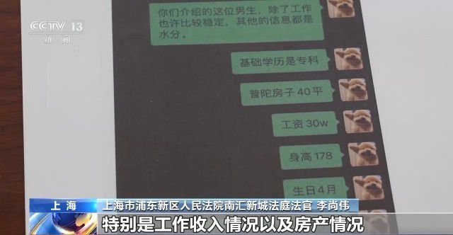 上海市浦东新区人民法院南汇新城法庭法官 李尚伟:王女士觉得还蛮搭配就欣然赴约,但是参加第一次约见之后,她发现男士的信息和婚介公司提供的是相差很大的。不管是出生的月份、身高,特别是工作收入情况以及房产情况,都是差距很大。