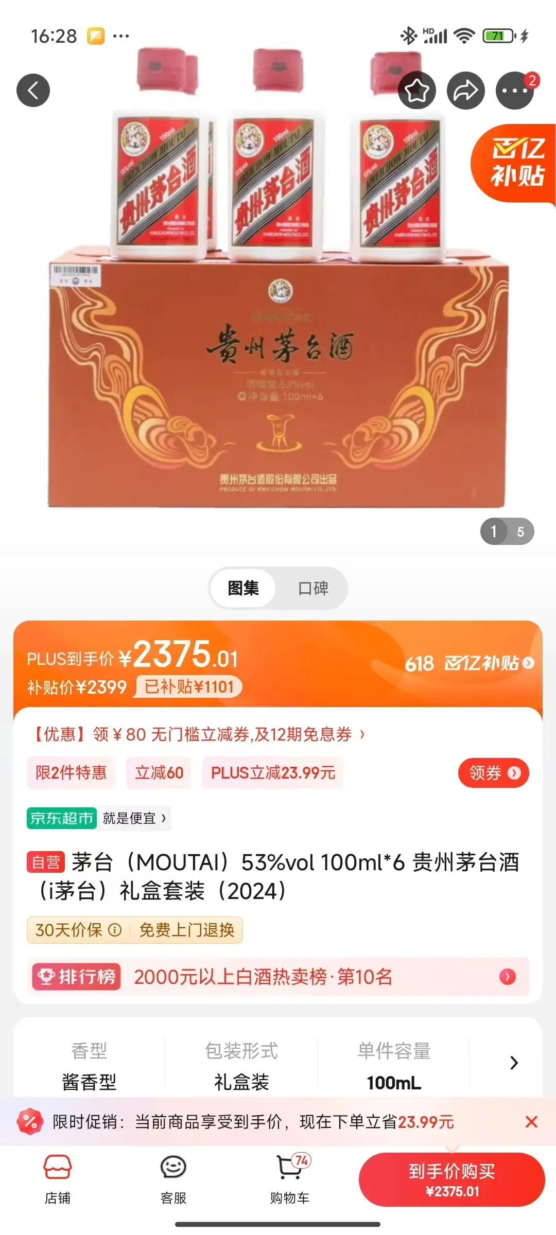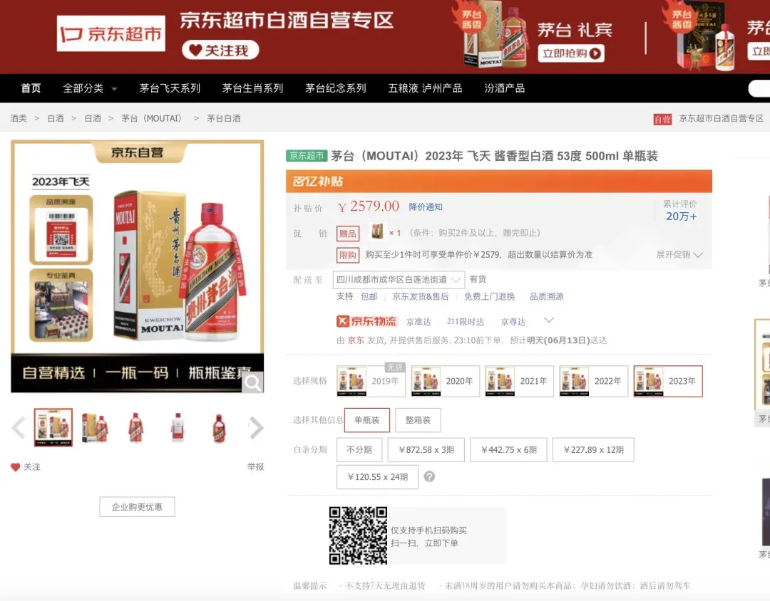 据京东电商平台显示,贵州茅台京东自营店所售飞天茅台定价为1499元/瓶,依然需要预约申购、一瓶难求。在京东超市白酒自营专区中,2023年出厂的53度500ml散装飞天茅台酒售价为2579元/瓶;另外,6瓶2024年53度100ml的贵州茅台酒(i茅台)礼盒套装售价则为2375元/套,可以直接购买。