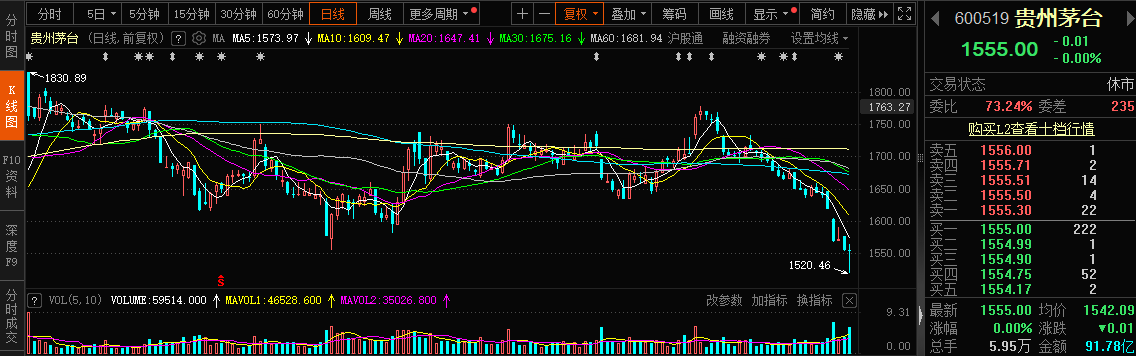 茅台批价的快速下挫也明显传导到了资本市场。上周贵州茅台股价击穿1600元整数关口,最低下探至1520.46元/股,该股股价一周跌近4%。值得一提的是,在茅台股价持续走低的过程中,北向资金也在不断抛售,上周四个交易日,北向资金仅在周五小幅净买入9757万元,上周总体净卖出该股37亿元。