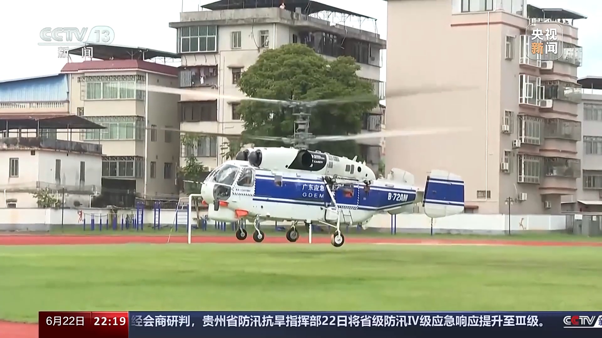 梅州灾情集中于北部山区,地质结构复杂,面对强烈的洪水冲击和浸泡,道路损毁严重,而以砖木结构为主的房屋也极易倒塌,不少地方断水、断电、通讯中断。平远县,录得全市最大平均雨量,其泗水镇是受灾最严重的地区之一,6月16日晚6时起,该镇大新村完全与外界失去联系。要尽快畅通道路,让更多救援力量涌入,更要想办法如何第一时间前往村中救人、送物资,此时,直升机派上了用场。平远县体育场,直升机搭载着救援物资和人员,前往泗水镇。