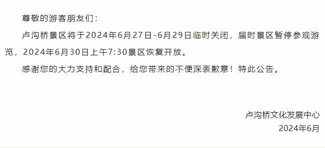 卢沟桥景区6月27日至29日临时关闭 2024-06-24中国新闻网 中新网6月24日电 据卢沟桥文化发展中心微信公众号消息,卢沟桥景区将于2024年6月27日-6月29日临时关闭,届时景区暂停参观游览,2024年6月30日上午7:30景区恢复开放。 编辑:林辉