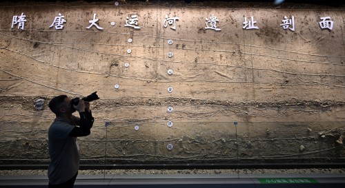 在宿州市博物馆三楼汴水咽喉展厅内,有一面千年大运河地层剖面墙,它长54米、高4米,来自灵璧凤山大道隋唐运河遗址,是目前国内最长、时代跨度最大的运河河道剖面。宿州市博物馆副馆长高雷介绍,转移过程融合了不少现代科技,如今,河道剖面上粗糙的泥沙淤积层,及夹杂着的石块、瓦砾、陶瓷片、动物骨骼等,构建起大运河运载千年的“时间密码”,让人们在博物馆内即可瞻仰厚重的历史。