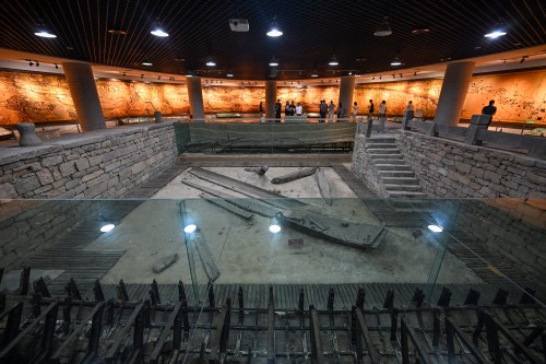 柳孜运河遗址出土的陶瓷器种类繁多,涵盖了隋唐宋时期全国南北二十多个著名窑口,这些珍贵文物在馆内隋唐瓷器厅、宋代瓷器厅内得到了完美展示。值得一提的是展厅里陈列着一艘出土的唐代货船,出土时船头缺损,只留下部分船身,加上尾部拖舵总长12.6米,大运河繁忙的通航能力由此可见一斑。