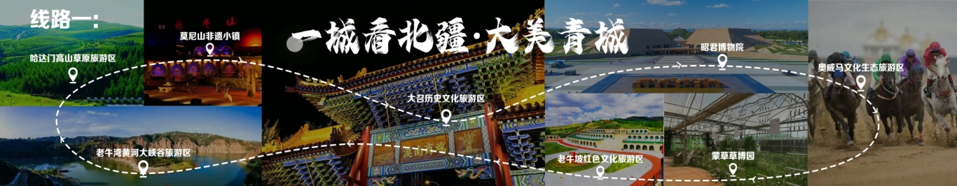 行程由呼和浩特出发,至哈达门高山草原旅游区,至莫尼山非遗小镇,至大召历史文化旅游区,再至昭君博物院,再至奥威马文化生态旅游区,再至蒙草草博园,再至老牛坡红色文化旅游区,终点为老牛湾黄河大峡谷旅游区。