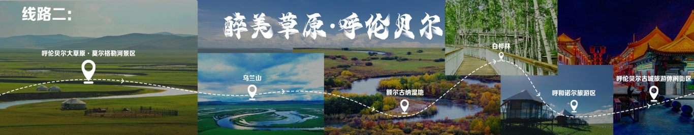 线路行程由海拉尔出发,至呼伦贝尔大草原·莫尔格勒河景区,至乌兰山,至额尔古纳湿地,再至白桦林,再至呼和诺尔旅游区,终点为呼伦贝尔古城旅游休闲街区。