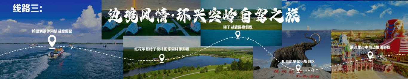 线路行程由乌兰浩特出发,至翰嘎利湖休闲旅游度假区出发,再至红花尔基樟子松林国家森林旅游区,再至诺干湖旅游度假区,再至扎赉诺尔猛犸旅游区,终点为满洲里市中俄边境旅游区。