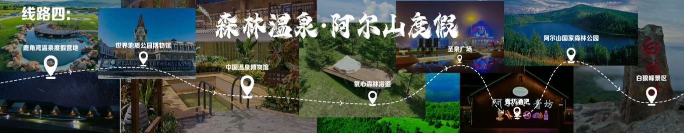 线路行程由阿尔山出发,至鹿角湾温泉度假营地,至世界地质公园博物馆,至中国温泉博物馆,再至氧心森林浴道,再至圣泉广场,再至青坊酒吧,再至阿尔山国家森林公园,终点为白狼峰景区。