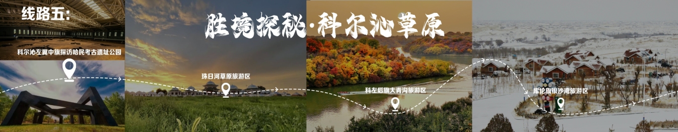线路行程由通辽出发,至科尔沁左翼中旗探访哈民考古遗址公园,至珠日河草原旅游区,再至科左后旗大青沟旅游区,终点为库伦旗银沙湾旅游区。
