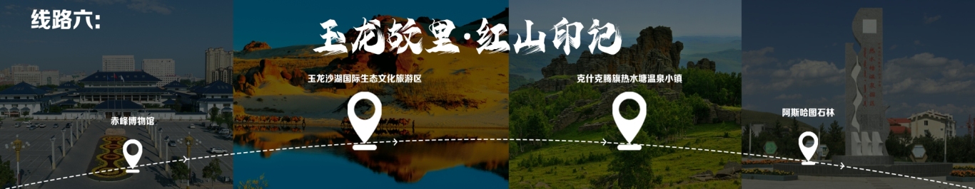 线路行程由赤峰出发,至赤峰博物馆,至玉龙沙湖国际生态文化旅游区,再至克什克腾旗热水塘温泉小镇,终点为阿斯哈图石林。