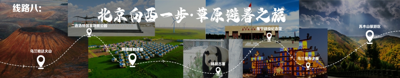 线路行程由北京出发,至乌兰哈达火山,至二连浩特国家地质公园,至辉腾锡勒草原,至林胡古塞,再至集宁战役纪念馆,再至乌兰察布之夜,终点为苏木山旅游区。