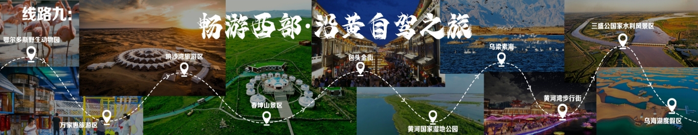线路行程由鄂尔多斯出发,至鄂尔多斯野生动物园,至万家惠旅游区,至响沙湾旅游区。到达包头,至春坤山景区,再至包头金街,至黄河国家湿地公园。到达巴彦淖尔,至乌梁素海,再至黄河湾步行街,再至三盛公国家水利风景区,终点为乌海湖度假区。