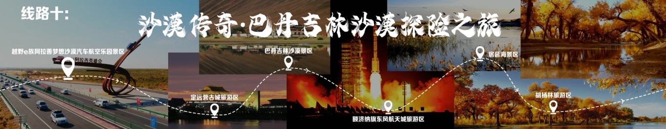 线路行程由阿拉善出发,至参观越野e族阿拉善梦想沙漠汽车航空乐园景区,至定远营古城旅游区,至巴丹吉林沙漠景区,再至额济纳旗东风航天城旅游区,再至居延海景区,终点为胡杨林旅游区。