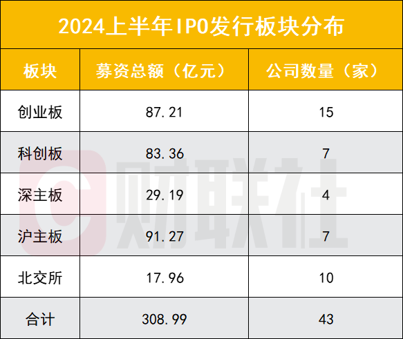 易董数据统计显示,截至6月30日,今年以来,发行上市家数共计43家,较去年同期减少75.14%;募集资金总额308.99亿元,较去年同期减少85.01%。