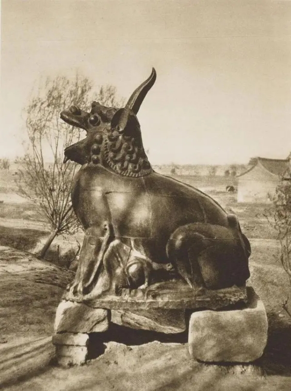 图为清朝末年德国著名建筑师恩斯特·柏石曼于当时太原水西门外拍下的明代獬豸铁像,如今陈列于太原纯阳宫中。